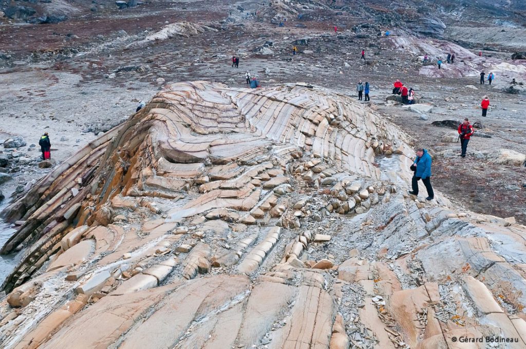 Today, you will enter Segelsällskapets Fjord, with the striped slopes of the Berzelius Mountains bordering the north side. You will land on the south shore, where ancient sedimentary formations lie at your feet. A hike takes you near a small lake with good chances to see musk oxen, Arctic hares, and ptarmigans.